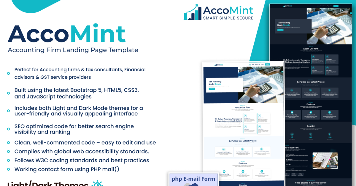 AccoMint is a clean, modern, and highly professional one-page HTML5 landing page template crafted for accounting firms, tax consultants, CA/CPA professionals, audit agencies, and financial service providers. Built with Bootstrap 5, HTML5, CSS3, and JavaScript, AccoMint comes with a built-in Light & Dark mode switch, refined UI components, and a conversion-focused layout designed to build trust and drive inquiries. With clean typography, well-structured content blocks, and polished financial-grade visuals, AccoMint makes it easy to showcase your firm’s expertise, highlight your services, present pricing, share success stories, and simplify client engagement through an optimized contact and consultation flow.