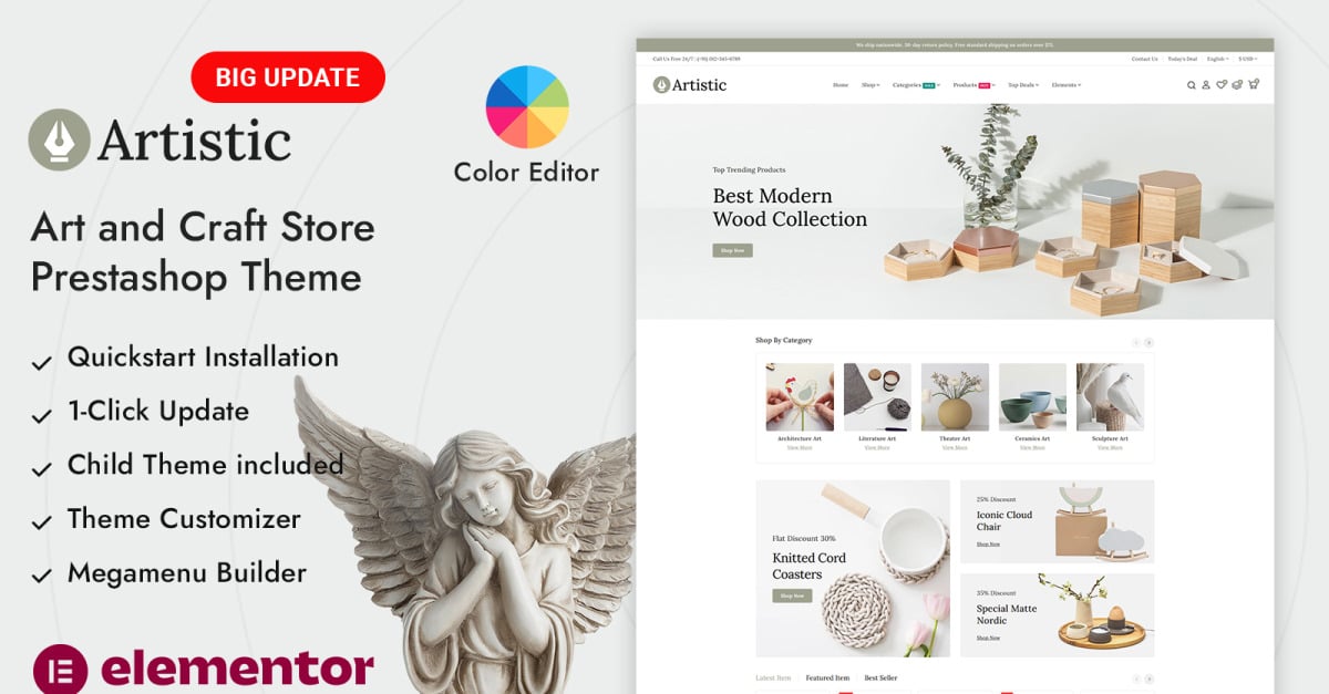 Artistic is a refined and visually appealing Handmade Art and Craft Store PrestaShop Theme created to showcase creative products with elegance and authenticity. Designed with a soft and expressive style, it perfectly suits handmade goods, craft accessories, pottery, paintings, home décor items, DIY products, and boutique artisan collections. The theme is developed with the Elementor Page Builder, which means every section and page layout can be customized visually using simple drag-and-drop editing. You can build unique homepages, product showcases, promotional banners, blog layouts, and more without writing any code.