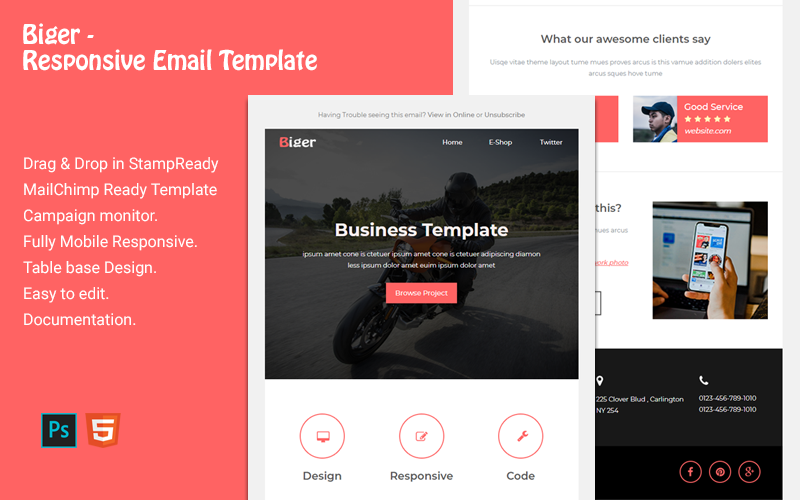 Biger - Responsive Email template with Stampready builder. Fully Responsive and Major email client Supported.You can easily make changes through MailChimp, campaign monitor or Drag & Drop in StampReady. Without any coding knowledge. Very Good Performance For Business, Portfolio ,Multipurpose and Any Purpose.