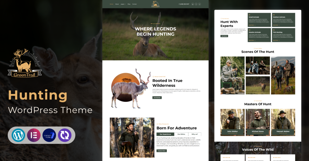 GreenTrail is a premium WordPress theme designed for hunting professionals, outdoor adventure companies, wildlife tour operators, and nature-focused brands. Built with a strong visual identity inspired by the wilderness, GreenTrail combines bold imagery, immersive layouts, and clean typography to create a powerful storytelling experience.