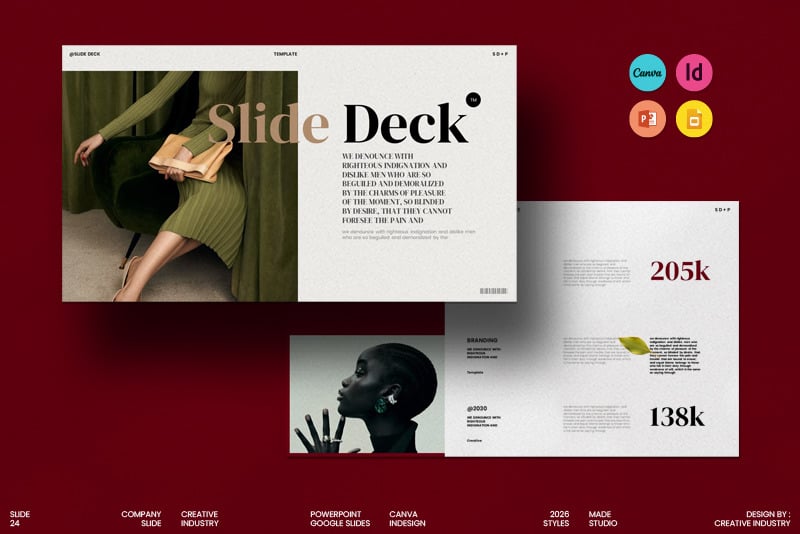 Slides Deck Presentation Style Template for you that you need unique, professional, clean, creative, simple presentation template. All slides designed using great style. All element easy to edit and you can easily change the color to match it with your personal or company brand.