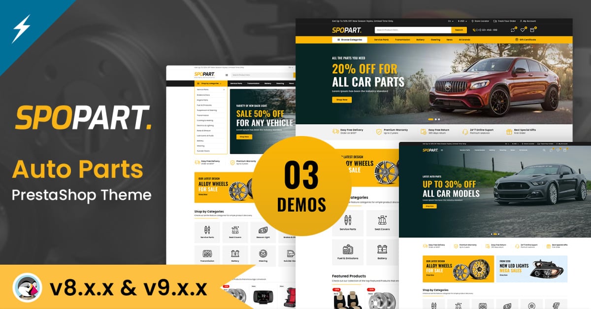 The theme of Spopart is spare parts and machine tools components. Spopart theme is versatile, responsive PrestaShop template with a well-known layout that is fully supported PrestaShop v1.7.8 and v8.0.x platform. Spopart theme has a tonne of features with modules that draw attention to your products, including stunning and popular effects pages that make the layouts of your products on your website stand out. Full customization possibilities, such as versatile theme choices, quick page loading, the most recent modules, round-the-clock support services, and more, were provided by Spopart theme. The Spopart theme is offered with a brand-new, trendy look that is also SEO optimised for a website that is web search engine friendly.